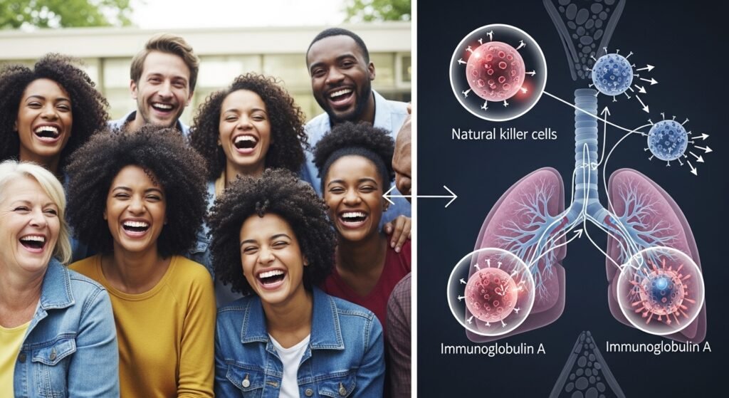 Immune markers respond to emotional states. Laboratory studies associate laughter with increased activity of natural killer cells. These cells support immune surveillance. Blood sample analysis after humor exposure shows changes in immunoglobulin levels linked with respiratory defense.