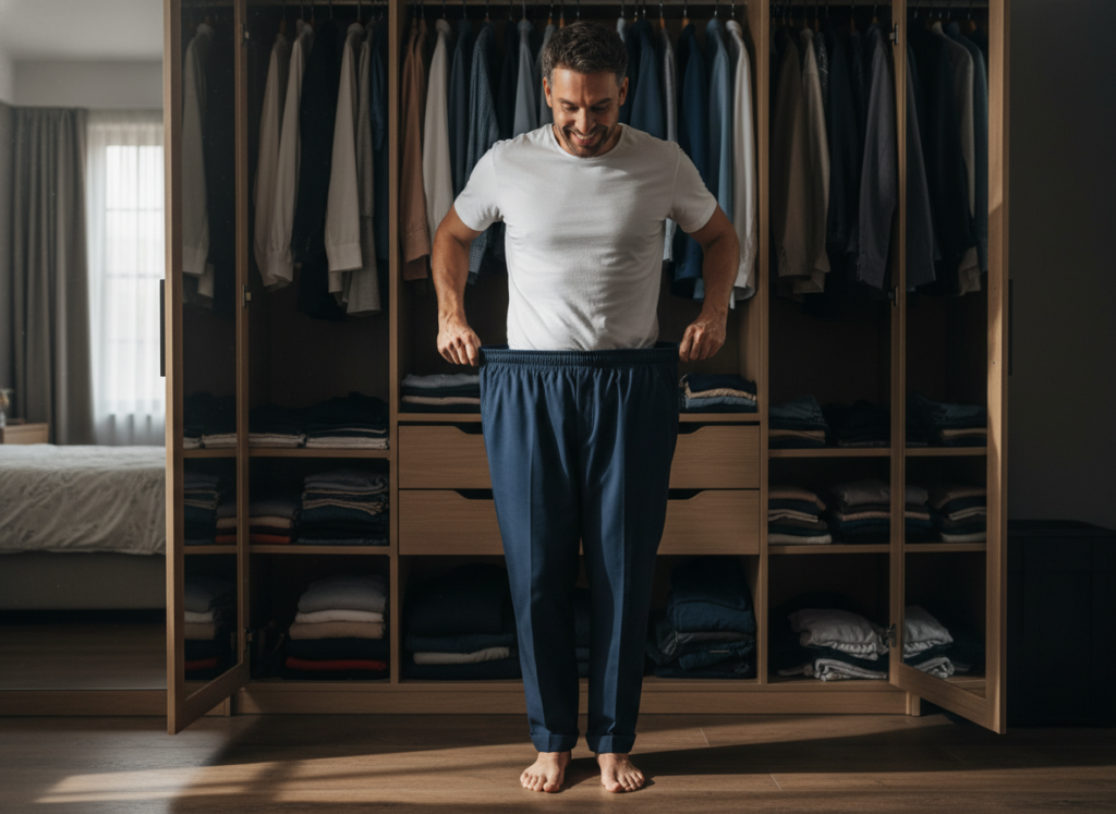 Though weighing in might not show a lot of changes at this stage, there would be some body composition changes. You are likely losing a bit of fat in gaining some lean muscle. You may find that jeans feel a little loose around their waist or that shirts feel a little tight around the shoulders. This is commonly regarded as the first tangible evidence that your hard work is paying off.