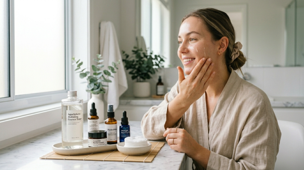 The routine started with double cleansing, followed by toner application and essence application and serum application and moisturizer application. The biggest change was how hydrated the skin felt. The skin appearance showed improved freshness, although the dramatic glow stayed absent because the base looked healthier.