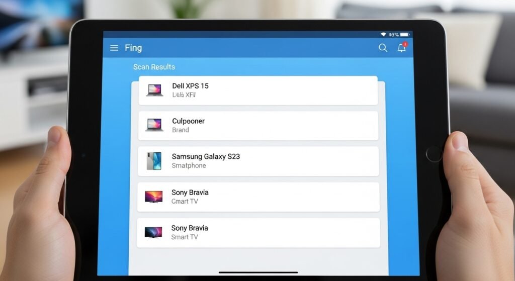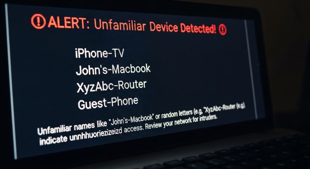 The available list contains names like “iPhone” and “Samsung-TV” for display. You need to identify unfamiliar names as “John’s-Macbook” or any collection of random letters since they indicate that an intruder exists on your network.