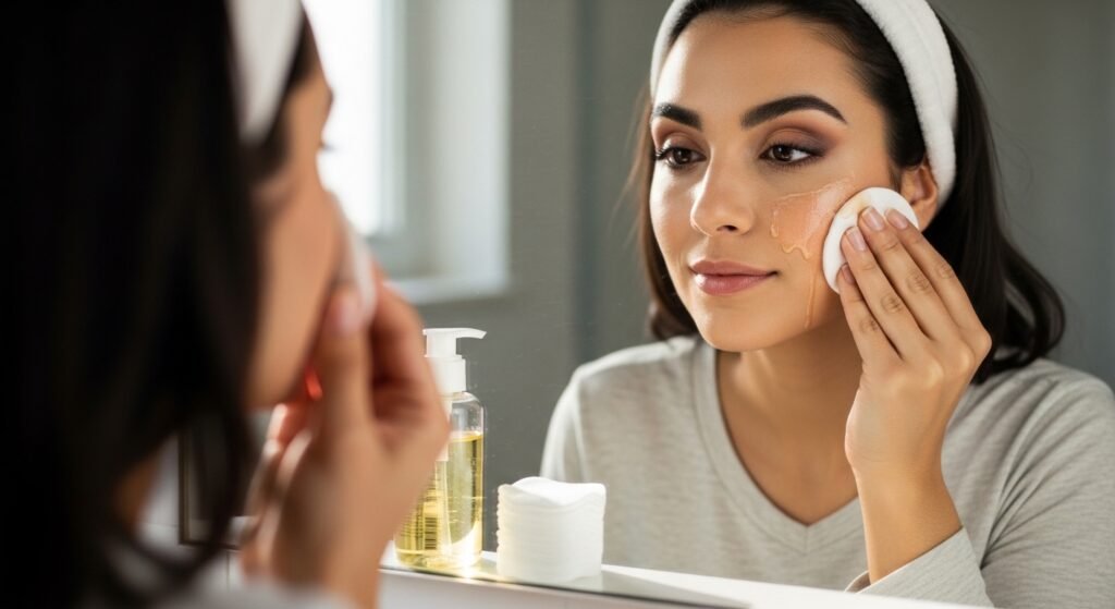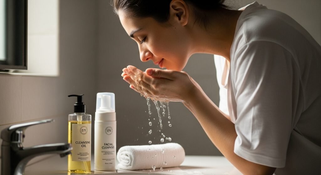 The method emphasizes massaging cleansing oil for several minutes, which helps break down makeup, sunscreen, and excess sebum more effectively than quick cleansing routines commonly followed in daily skincare practices.
