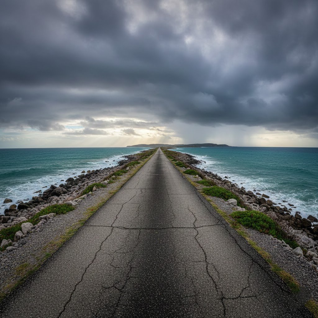 Land, for the Marshall Islanders, is anything that descends from the ocean, yet threats derive from it. Indeed, it is so slender that, standing anywhere on it, one can almost have a view from one ocean to the other across the highway. Seeing no more high ground to retreat to, extinction over the very borders of their homeland is the very prospect with which the islanders live; indeed, the ever-encroaching ocean washes over it.