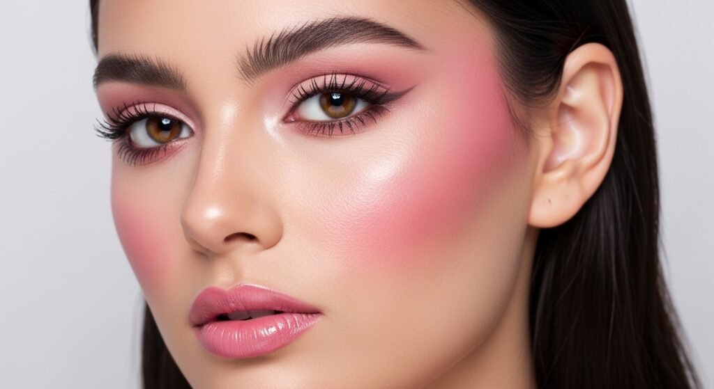 Blush applied across cheeks and temples created a lifted, artistic effect. This trend has resurfaced in modern makeup, appreciated for its ability to add warmth and dimension without heavy contouring.