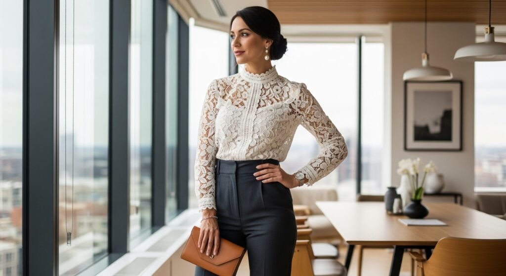 Tailored pants combined with lace tops create a balanced look that blends softness with structure. This pairing works well for occasions that require a polished appearance without feeling overly formal or restrictive.