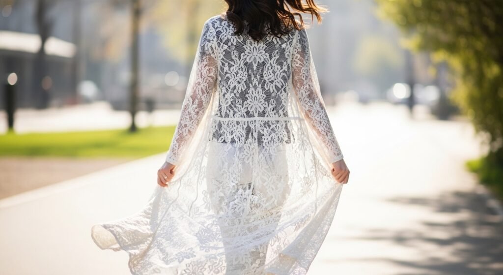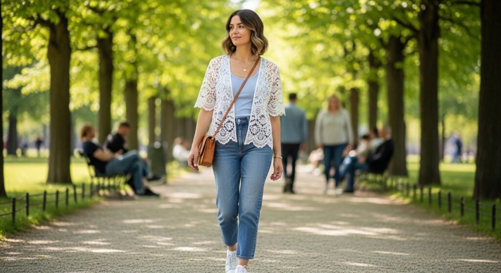 Long lace cardigans are becoming a favorite layering piece. Worn over simple tops and trousers, they add texture and movement while keeping the outfit light, elegant, and practical for different weather conditions.