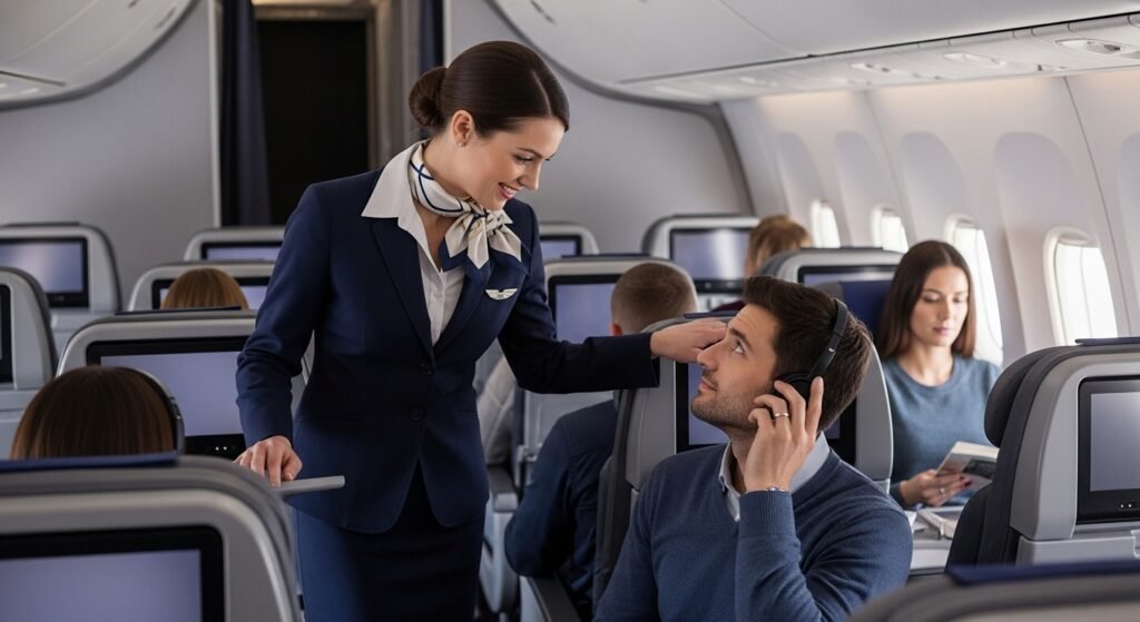 Flight attendants play a key role in maintaining cabin order. They monitor passenger comfort and handle issues calmly. When audio disturbances occur, politely remind travellers to use headphones and follow onboard guidelines.