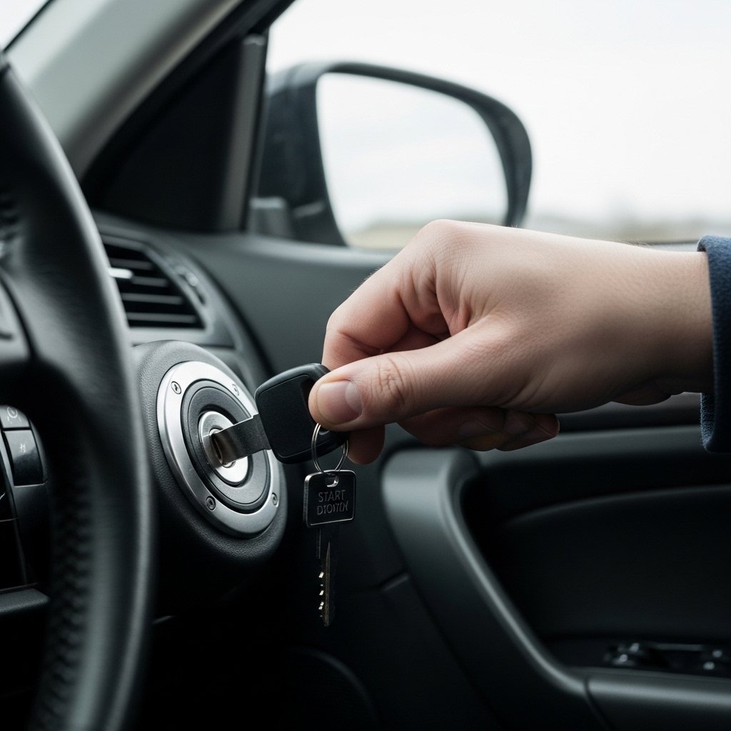 If the vehicle uses a physical ignition cylinder, insert the mechanical key and turn as usual. The electronic portion of the fob does not affect engine start in these systems. Only remote locking and unlocking functions stop working.