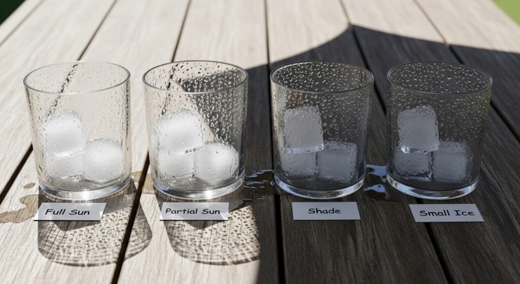 An ice cube placed in different environments melts at varying speeds. This simple setup becomes engaging as viewers compare conditions and outcomes, finding unexpected interest in a familiar process.