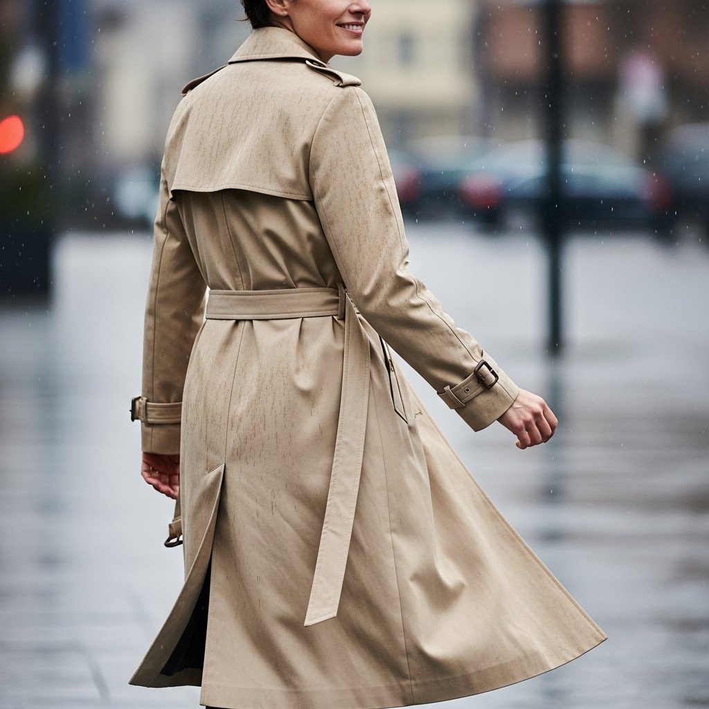 A trench coat is worn extensively and does not get disheveled during rain. Blends of cotton and water resistant treatment work better compared to untreated fabric. The waist is defined by belted designs and enhances the proportion. The colors are beige, olive or black which match well with most of the wardrobes.