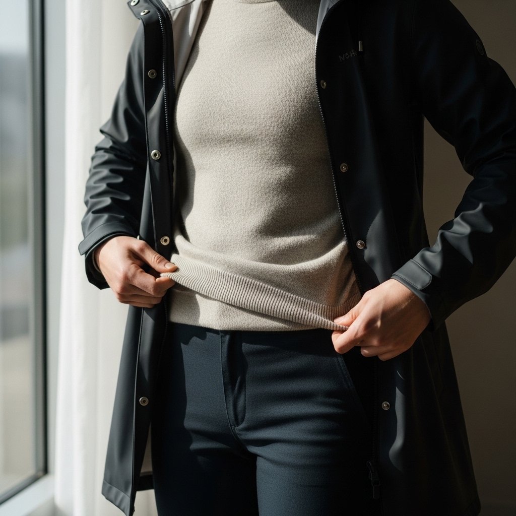 Knitwear is lightweight and does not trap moisture. The material like merino wool keeps cooler than the blend of synthetic fabrics in wet air. Bulkyness can be avoided by a tight-fitting sweater inside a rain jacket. Solid colors are more neat in silhouette and have a minimized picturesque in layered clothes.