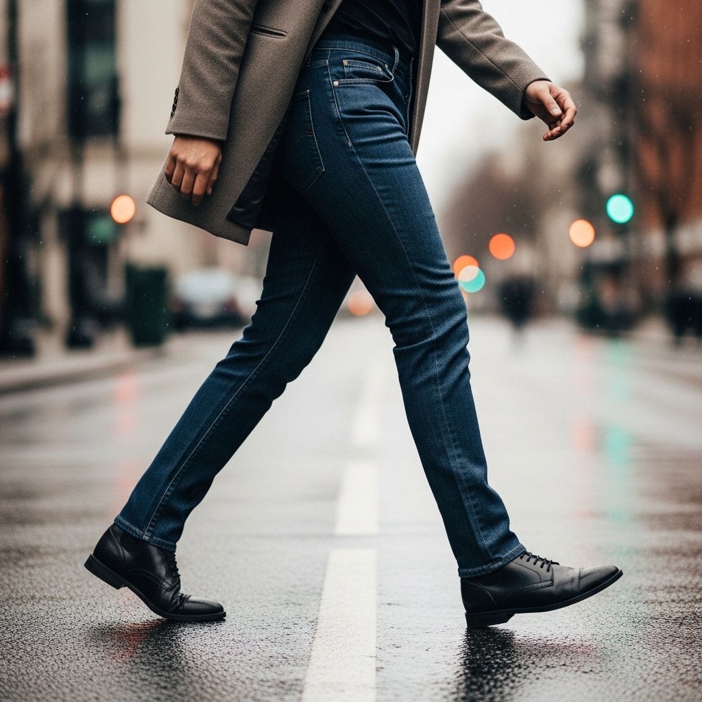 Darker denim removes water spots better than lighter washes. A slim or straight fit helps to avoid clung-up fabric in case of dampness. Stretch blends are good so that the movement is maintained without losing structure. Denim sets and neutral outerwear are a harmonious mix to look at in the workplace or other informal environments.
