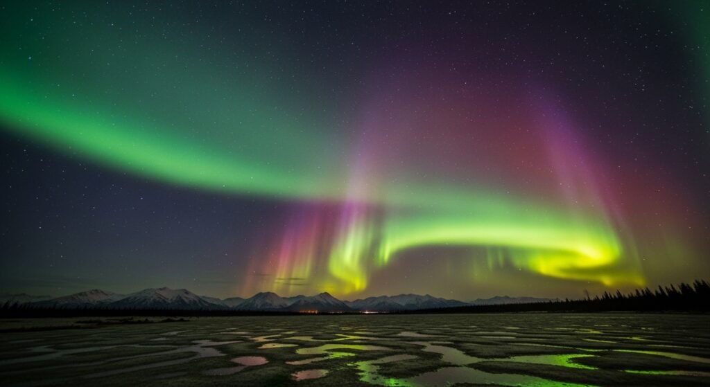The “Northern Lights” currently appear mainly at locations close to the North and South Poles. During a flip the magnetic shield’s increased leakage will enable auroras to occur at locations much farther from the North and South Poles. The equator and your backyard will allow you to see the vibrant Southern Lights.