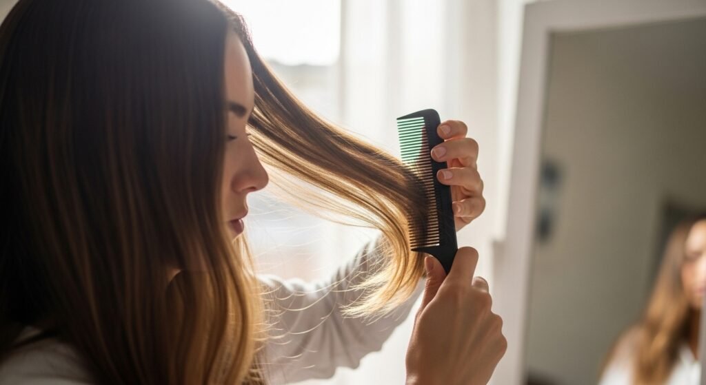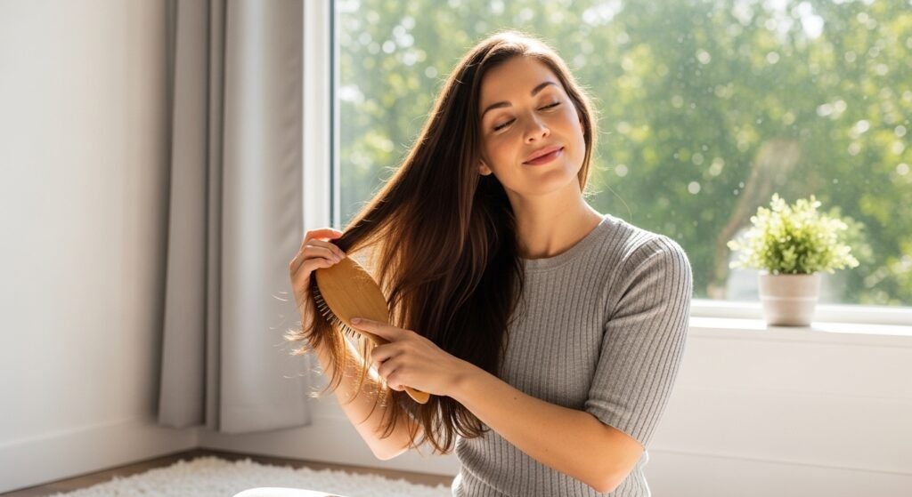 Brushing should feel calm, not rushed. Start near the ends and slowly move upward to release knots without pulling. A soft brush or wide comb protects strands and keeps the natural texture looking smooth daily.