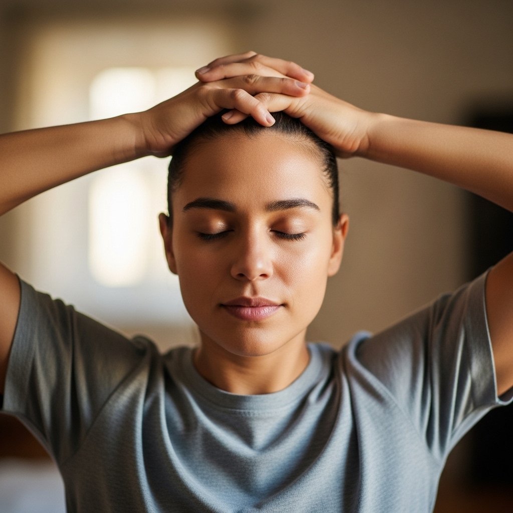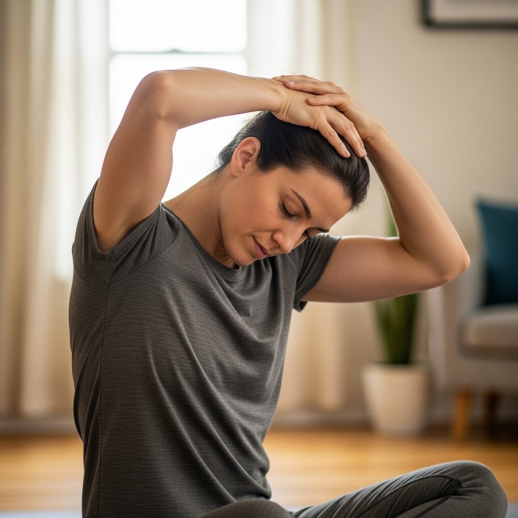 Suboccipital muscles tighten during prolonged downward gaze. The stretch begins with interlaced fingers supporting the skull base. Gentle forward nod increases stretch depth. Elbows stay relaxed. Short holds support circulation. This stretch suits end of day routines following device use.