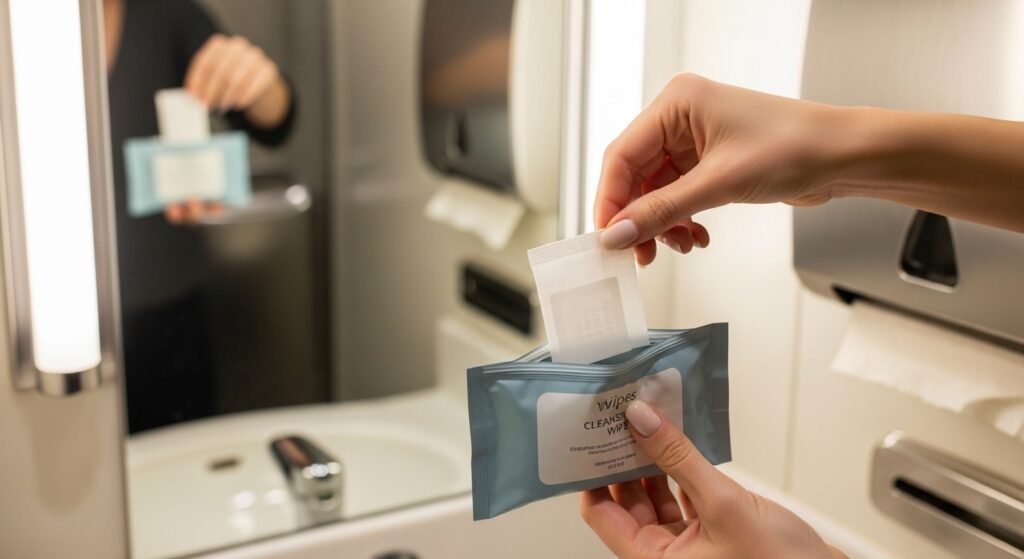 Travel-size cleansing wipes can refresh skin quickly during long workdays or travel. A quick clean-up removes moisture and bacteria, helping restore comfort and confidence until a full shower is possible.