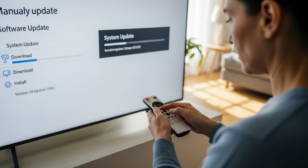 The Smart TV functions as a computer with a monitor display. The manufacturers deliver periodic updates which include bug fixes and interface performance improvements along with new application installations. Users need to perform manual update checks by going to the Settings menu and choosing Support and then Software Update every month.