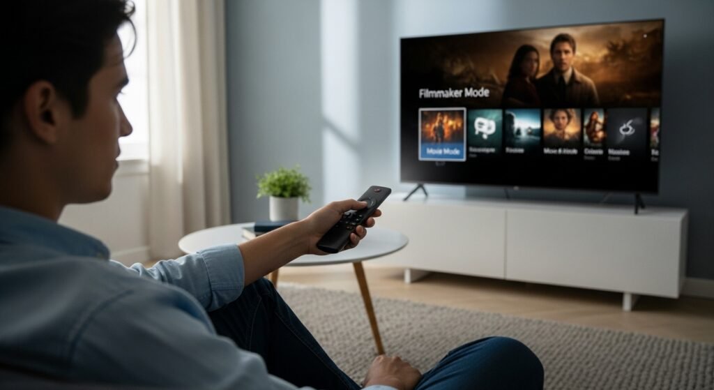 The typical television displays in Vivid mode or Standard mode which creates neon colors that appear artificial. The Filmmaker Mode or Movie Cinema mode delivers true-to-life color reproduction with accurate color delivery and contrast benefits. The initial experience appears dimmer but the system distributes light better for your vision.
