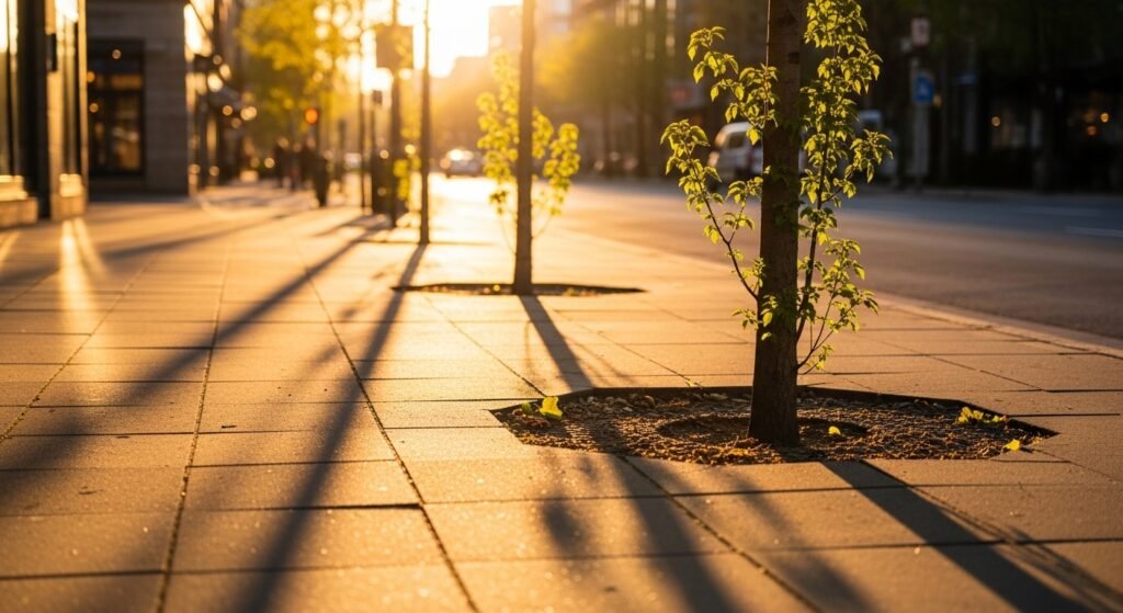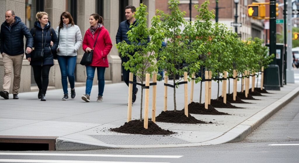 Small trees appeared along previously bare sidewalks. The change was simple but noticeable. Within days, passersby commented on the softer look of the street. Even a few new plants created a sense of care and attention.