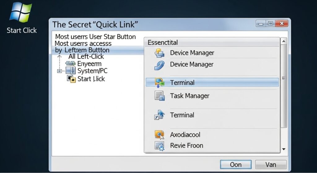 Most users access the Start button by performing a left-click. The special user menu delivers immediate access to essential PC functions through its display of Device Manager and Task Manager and Terminal tools. The interface enables users to access all system functions through a single menu which displays essential functions from their PC.