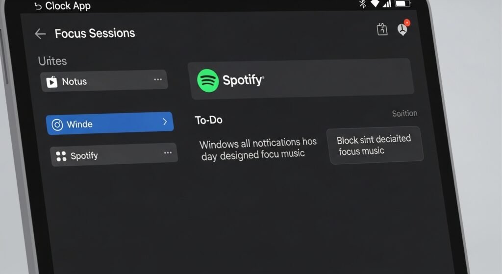 The Clock App includes Focus Sessions as a dedicated space which operates as a functional area within the application. The system unites your Spotify account and your To-Do lists into a single interface. Windows creates a silent environment by blocking all notifications while it plays designated focus music for an established period. The system operates as a productivity assistant which supports your shift into the dedicated work period.