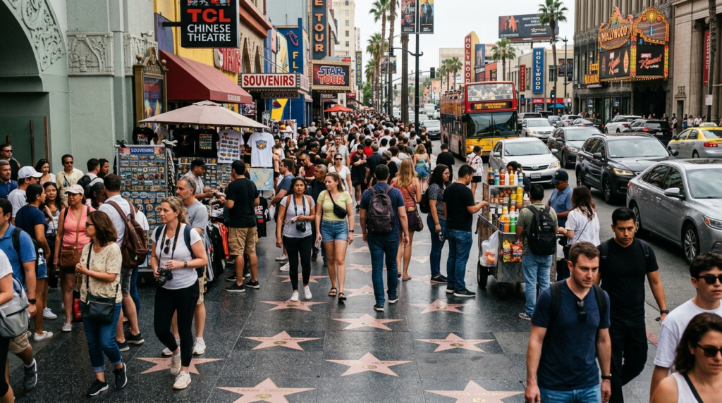 People tend to picture the Hollywood Walk of Fame as an elegant place filled with celebrities, but the actual site functions as a lengthy sidewalk that runs through an active shopping district. The area becomes filled with visitors who experience interruptions from both street vendors and passing vehicles.