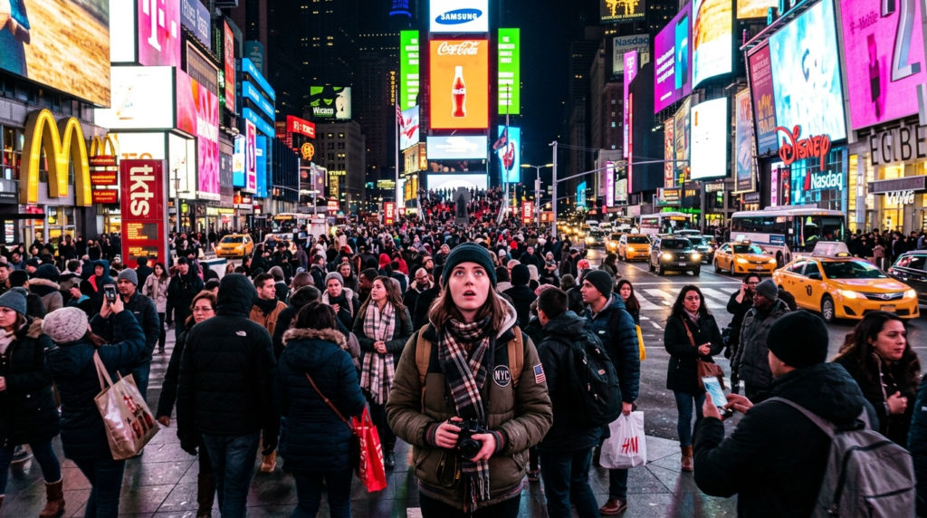 Times Square displays its peak visual appeal during night hours because of its enormous digital displays and unending movement. The area becomes unmanageable because of excessive visitor numbers and the presence of commercial content that dominates the surroundings.