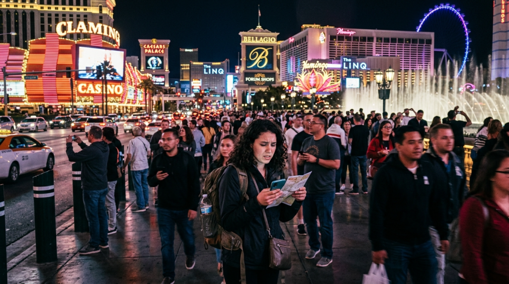The Las Vegas Strip has a lively atmosphere which combines strong visual elements, yet it creates an experience that exceeds people’s capacity to handle. The combination of extended walking routes together with dense foot traffic and elevated costs, creates a challenging experience for visitors to manage.