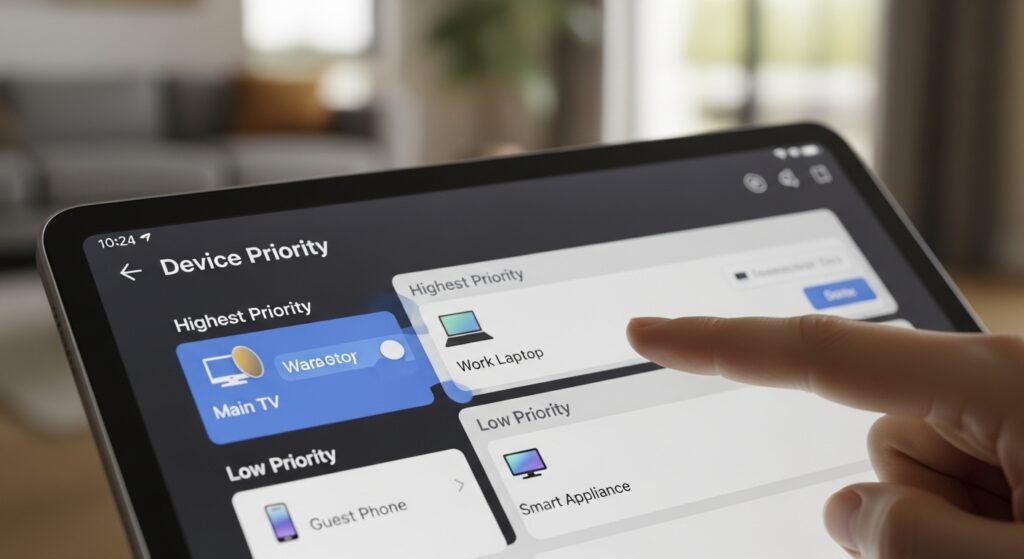 Users of modern routers can create device priority lists by dragging and dropping functions which the system provides. You can assign “Highest Priority” status to both your work laptop and main TV while moving guest phones and smart appliances to “Low Priority” status.