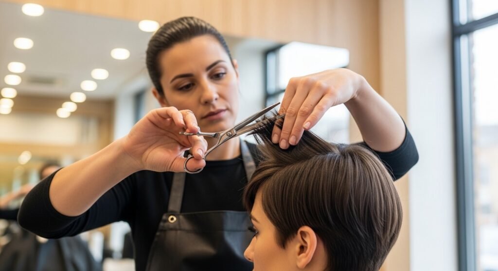 Light styling products work best for pixie cuts. A small amount of texturizing cream adds definition. Gentle blow-drying helps maintain volume at the crown, creating a polished look without excessive effort.