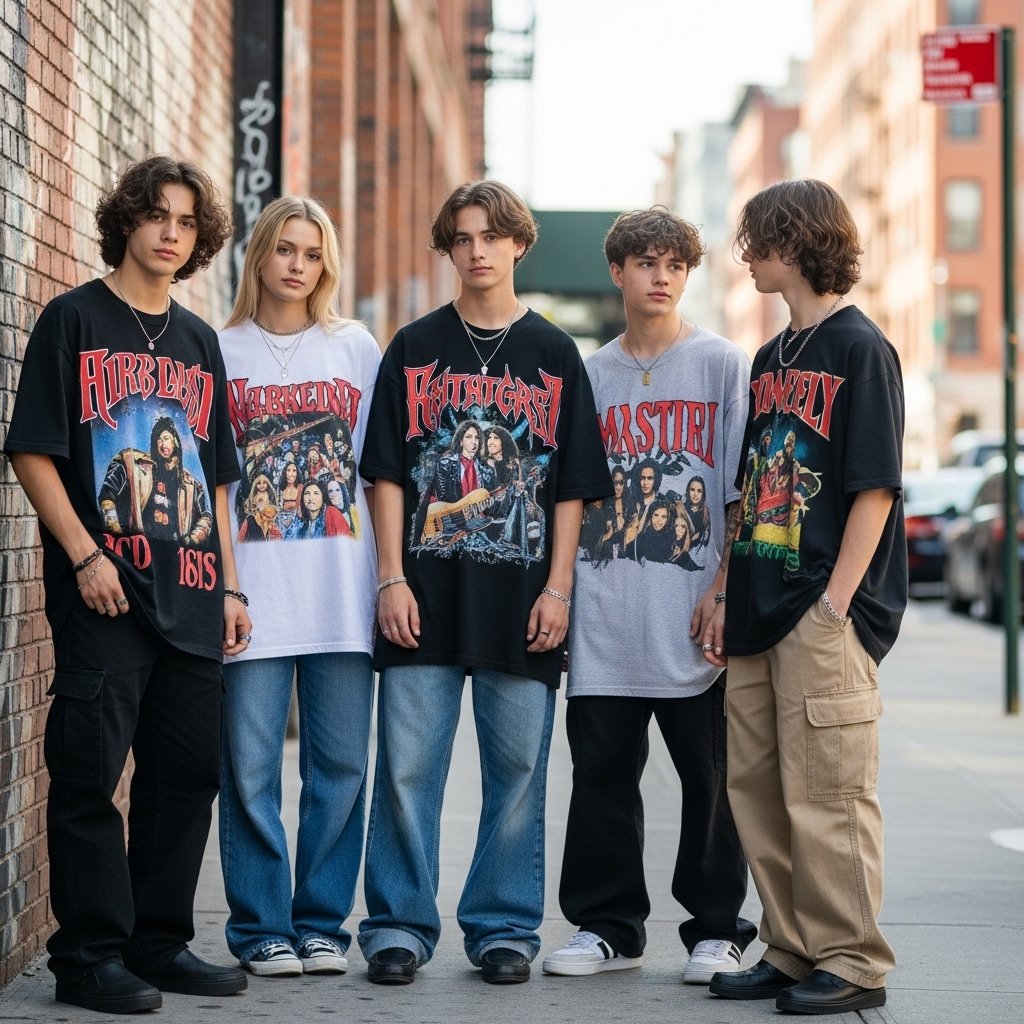 The loose graphic T shirts were popular in the 1980s as band shirts and skate scenes. The new trend of teens is similar loose fits with jeans or cargo pants. The huge logos and graphic prints resemble previous designs attributed to music tours and the street culture. The sizing decisions are made based on comfort and visibility and not form.