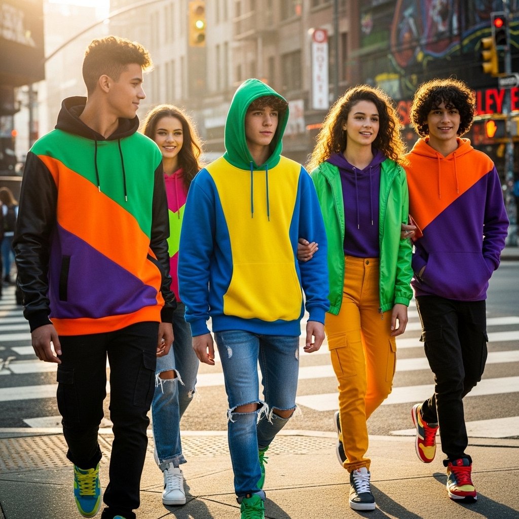 Color blocking became popular in the 1980s, both in sportswear and in music performances. Adolescents are now dressed in hoodies, jackets, and ensembles that have a sharp color demarcation. These are analogues of older training suits and windbreakers. Posts of outfits in social media are highly engaged in bright and segmented colors layout.