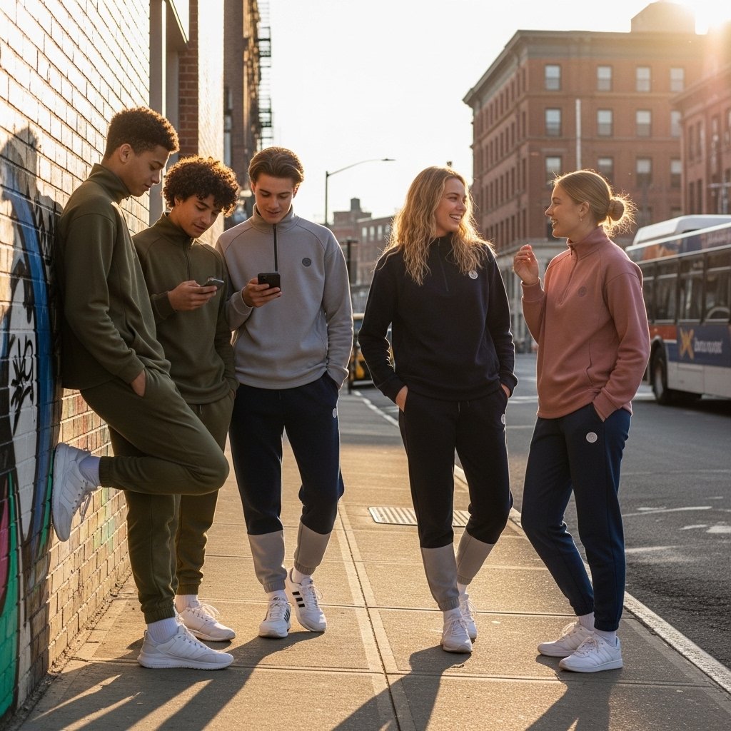 In the 1980s advertisement of breakdance culture and athletic branding made matching tracksuits popular. Young people nowadays put on co-ordinated outfits of fleece or technical material. According to the sales of youth specific brands, matching tops and bottoms are performing well. Adoption is fostered by convenience and aesthetics.