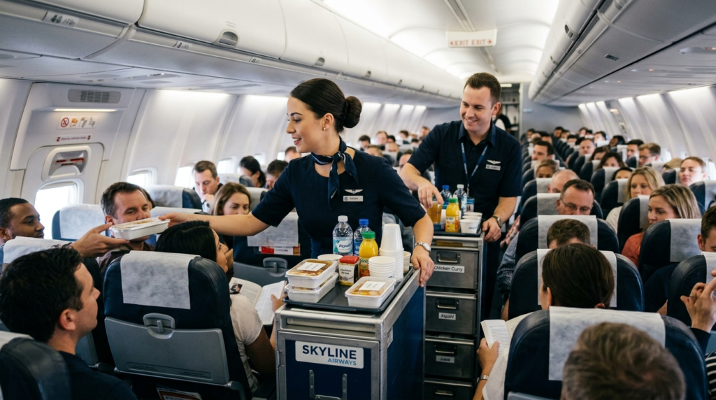 The galley serves as the area where crew members prepare food and beverages for passengers. The area remains active throughout long-distance flights which results in continuous sound and lighting and movement.