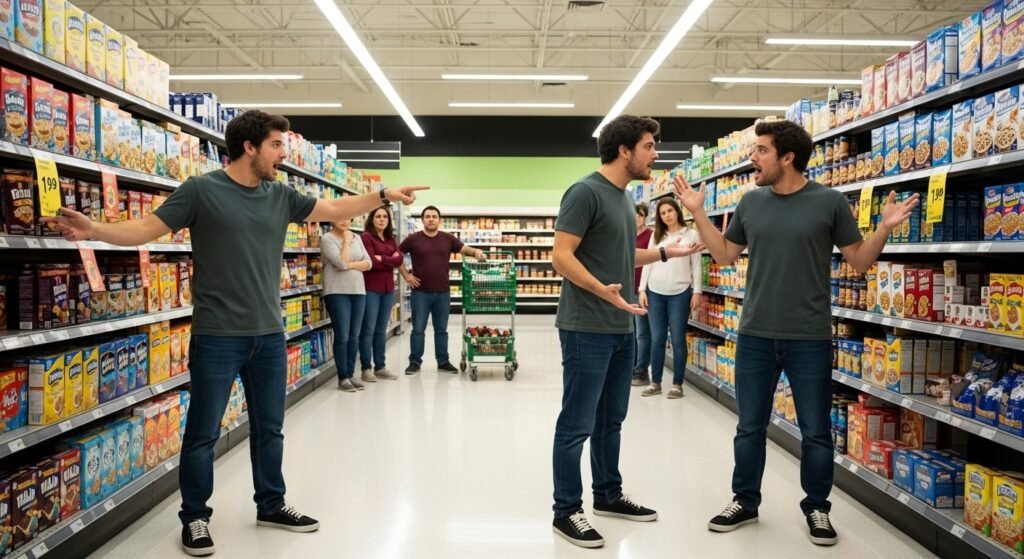 One of the twins argued about the increased prices and these were watched by shoppers. A few minutes later, the second twin came on another aisle towards the same end of the conversation. The repetitive gestures and phrases provided an effective feel of deja vu.