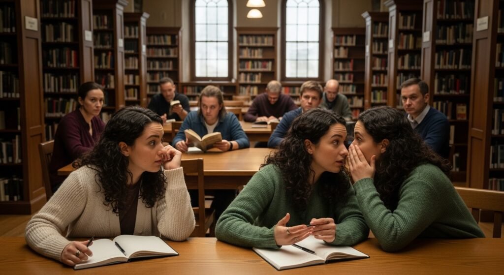 It was evident in a silent library, where one of the twins was whispering about writing a future memoir. The second twin requested the same recommendation later. People on the reading tables looked at each other questioningly.