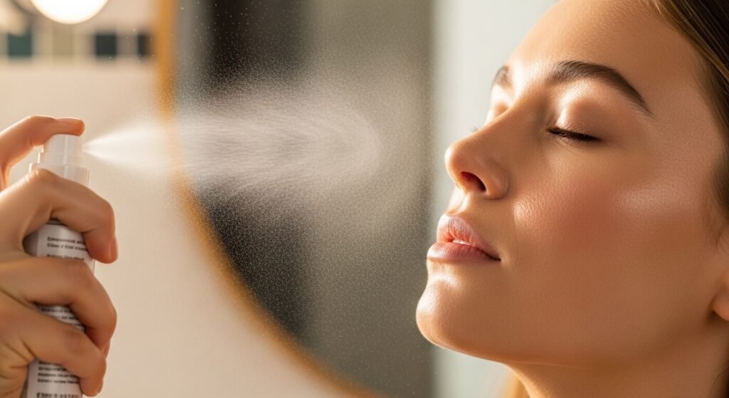 A quick mist of setting spray revives makeup and reduces any powdery look. It helps everything settle into the skin, giving a smoother and more natural finish.