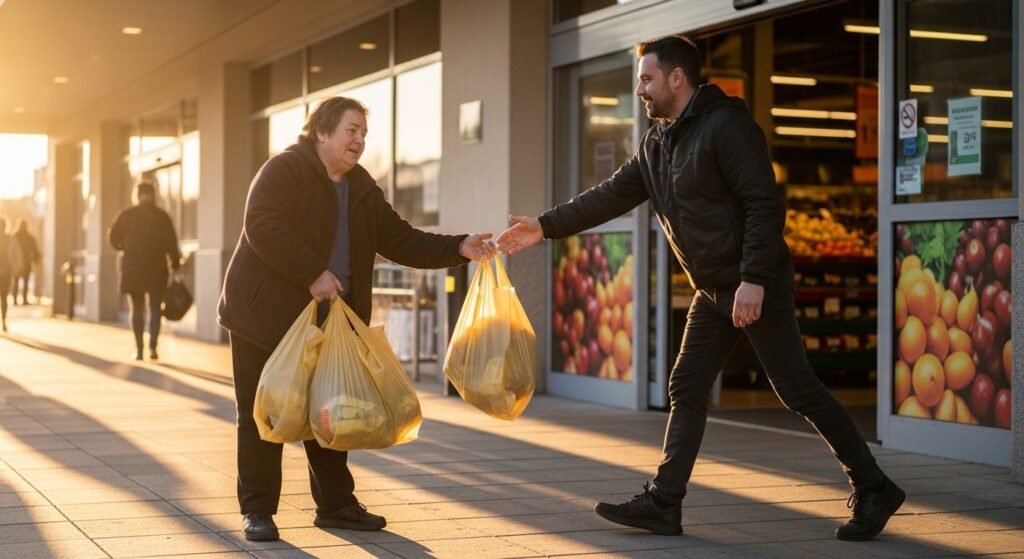 We waited there outside a store, having some bags that seemed to be too heavy. Some of them were passing, but at some point, someone offered to take one to the car. It was not so much dramatic as merely reflective and silent, kindly.