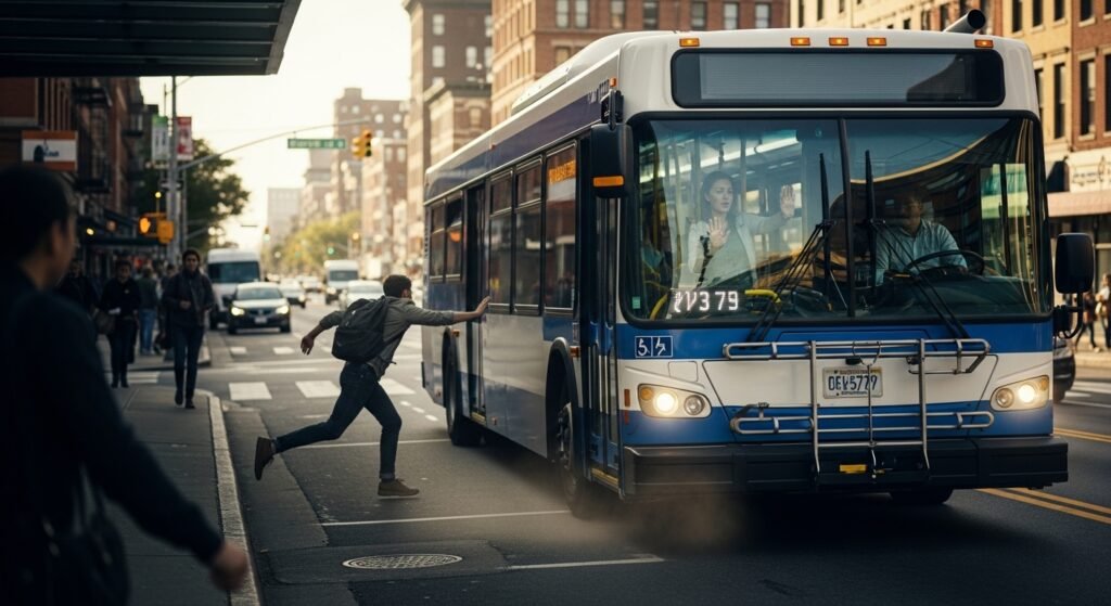 It was hopeless to run to a bus that had just begun its movement. One of the passengers who was close to the door indicated to the driver. The bus paused briefly. It could have been time, or perhaps group knowledge.