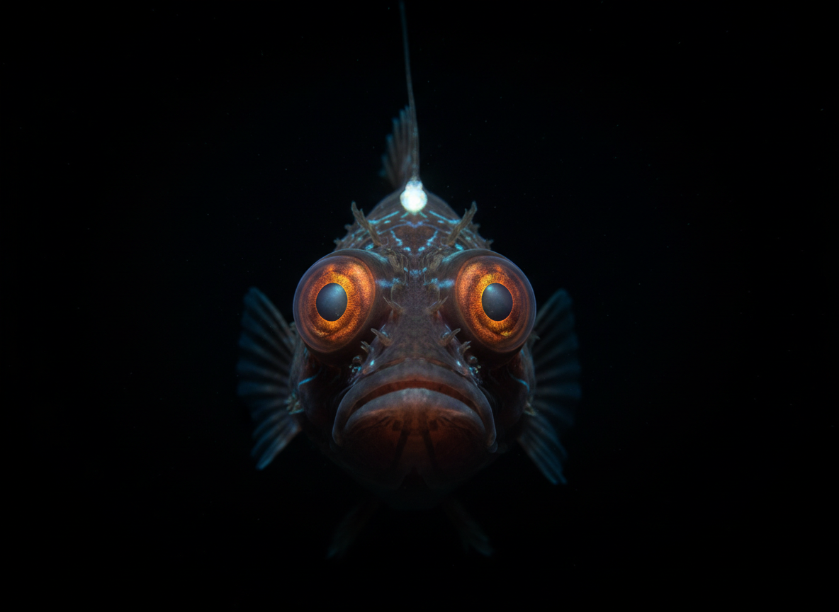 These animals generate light because there is no sun here. While most produce glowing “lures” such as Anglerfish to attract prey through baited traps, some can confuse predators by shooting into the air brilliant clouds of ink. There is “living light” in the ever flickering deep ocean.
