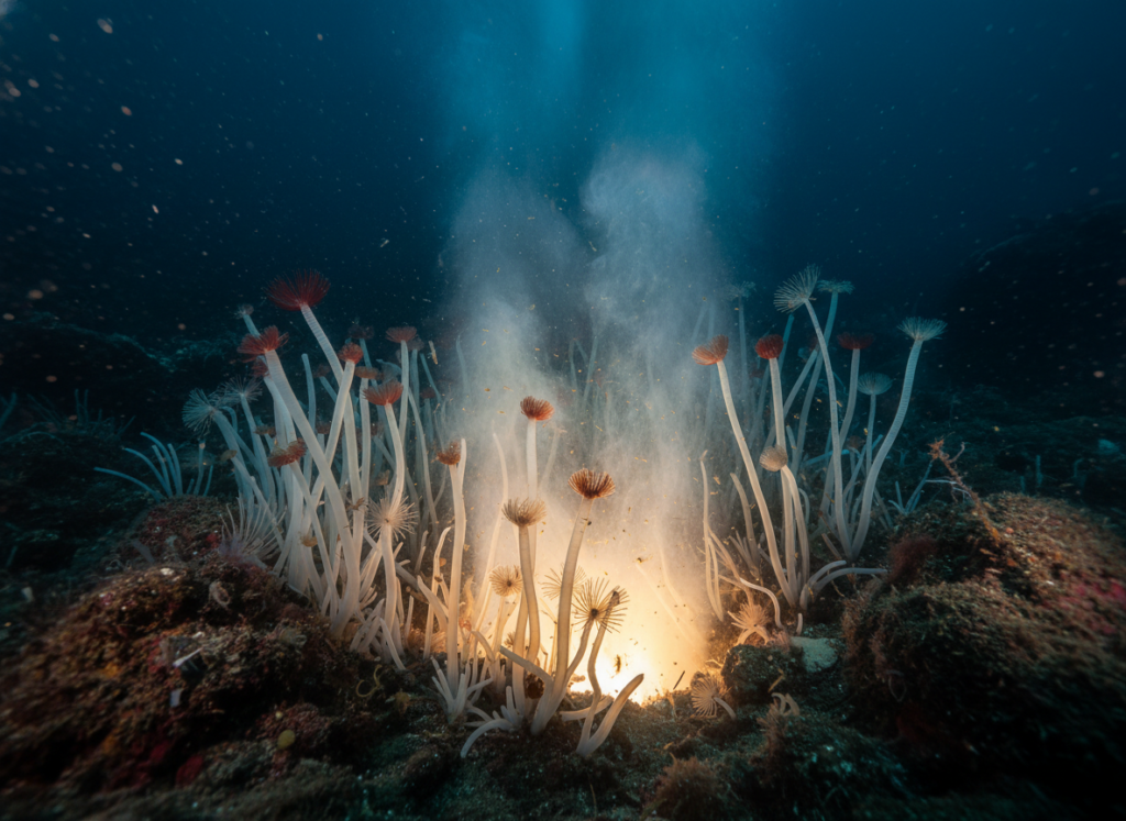 On the ocean floor, these so-called shafts are called “hydrothermal vents.” They spew out water so hot as 400°C (750°F). Despite the high temperature and poisonous minerals, these vents are full of life that loves extreme conditions.