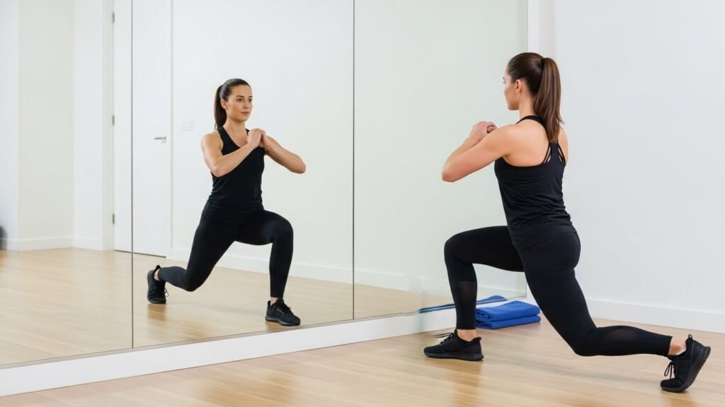 An upright torso and controlled step is a proper lunge. The foot frontal lands and the knee of the back drops down at the back. Toes and front knee follow the same direction of movement. The quality of repetition is safe with consistent depth and steady pacing.