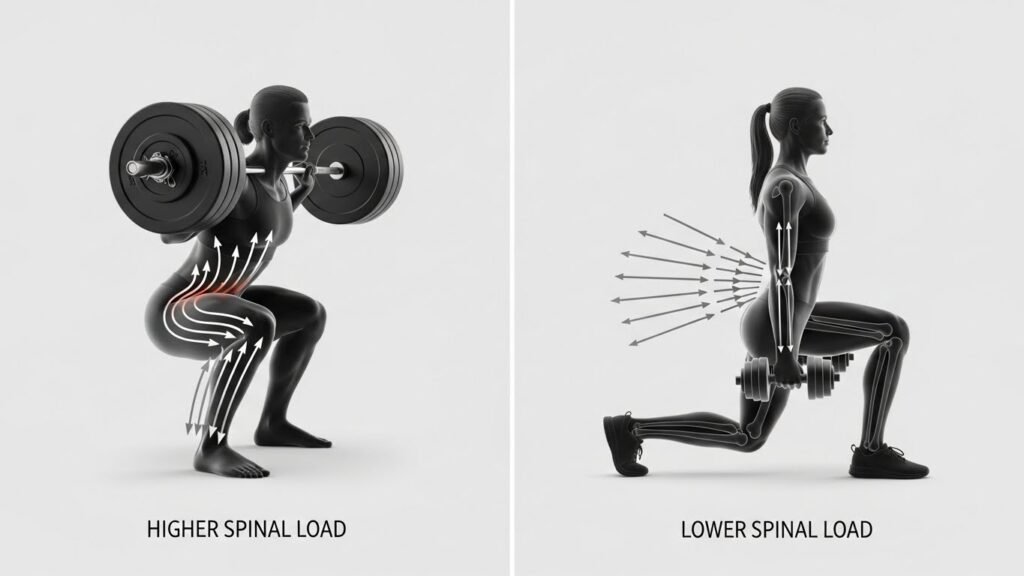 Lunges typically use lighter external resistance than squats. Lower axial load results in reduced compressive stress on the spine. Biomechanical analysis confirms forward lunges shift force toward the hips and legs rather than the lumbar region. This structure supports strength work with lower spinal fatigue.