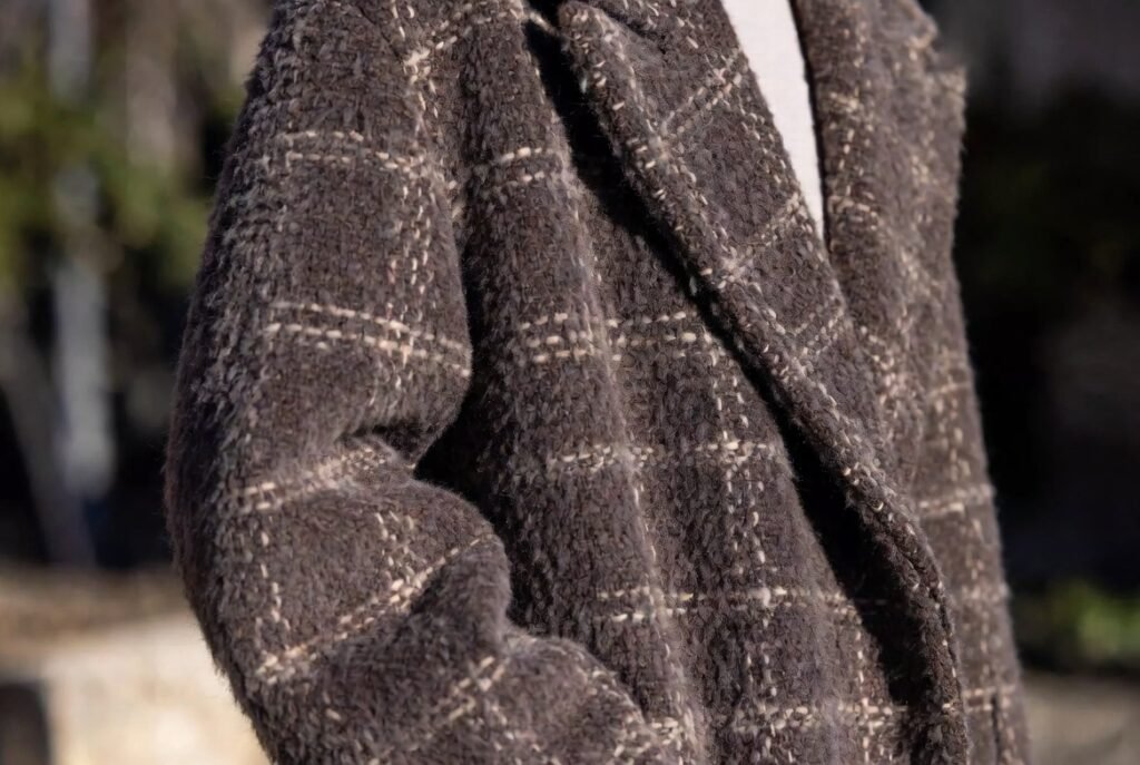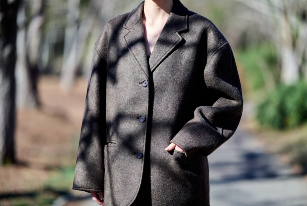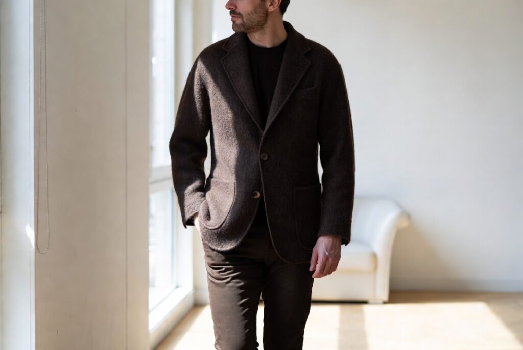Boiled wool holds form through fiber compression rather than heavy interfacing. Tailors favor this fabric for blazers due to natural drape control. The garment resists sagging at elbows and seams after repeated wear. Shape retention supports a polished look across daily movement.