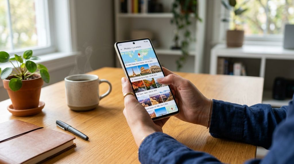 Google Photos stores photos that usually contain location information through their embedded metadata. Your images can show both the specific time and location of their creation which enables automatic organization based on your travel locations.